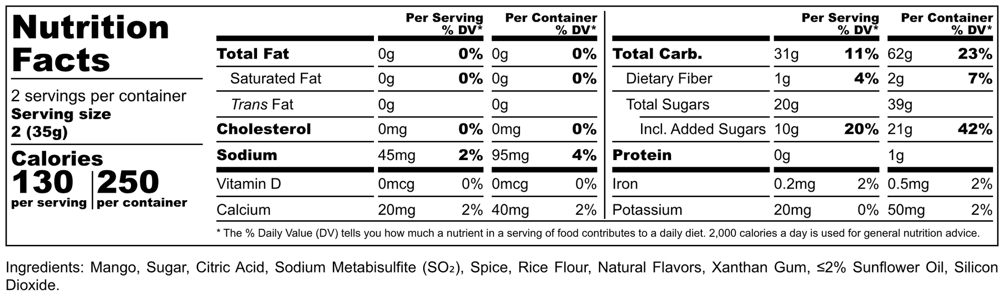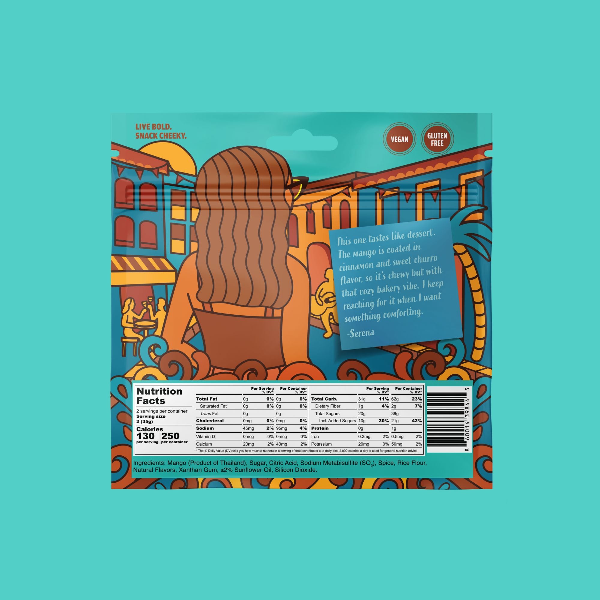 Chewy dried mango bites coated in a crystallized sweet cinnamon coating. This one will hit you straight away with a warm cinnamon aroma with a sweet and crunchy churro flavor to follow. This is perfect for dessert lovers and those seeking a spirited baked goods inspired snack.